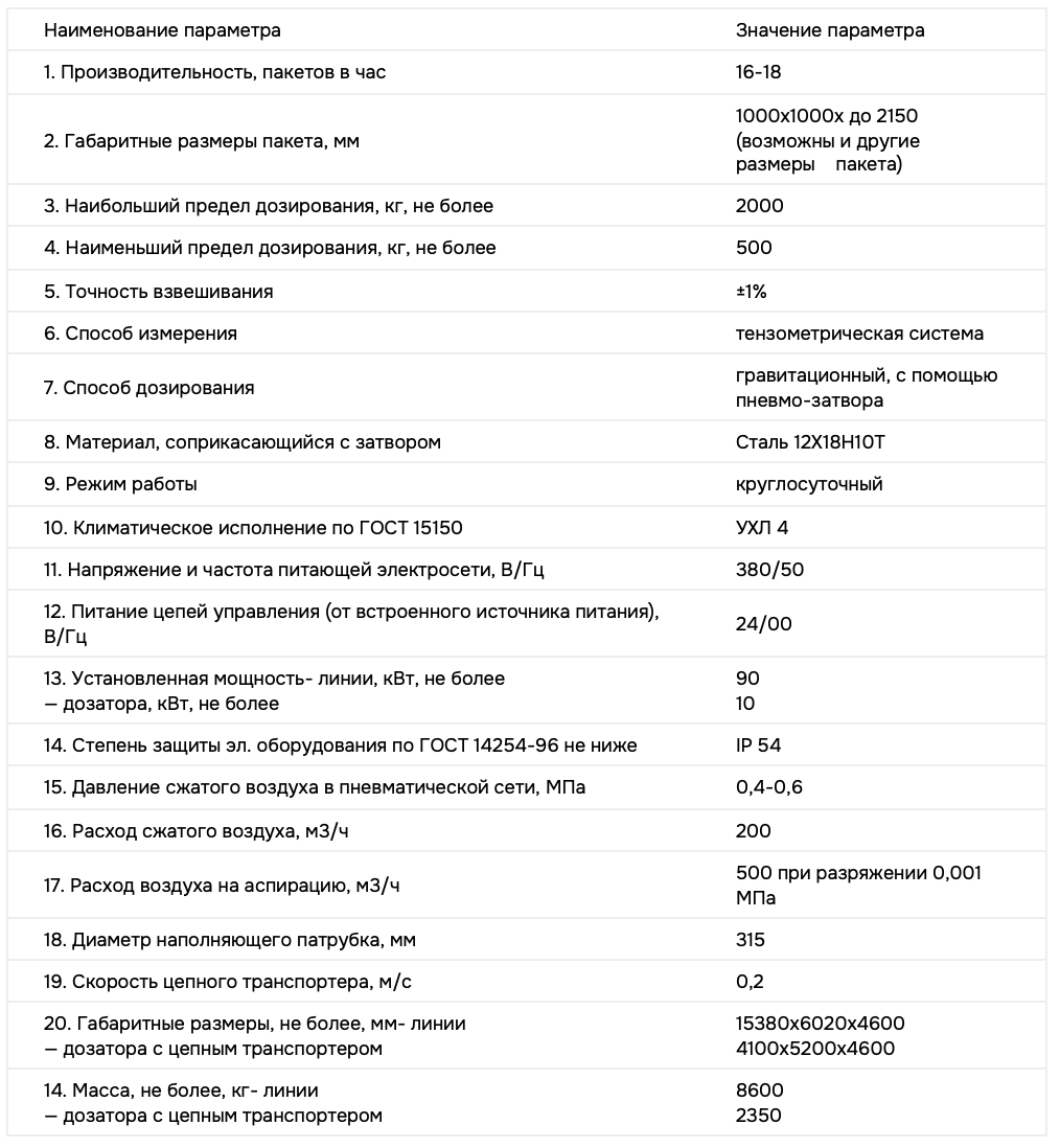 Линия предназначена для полуавтоматического весового дозирования сыпучих продуктов в контейнеры (big-bag) с последующим их укладыванием на поддон и упаковкой в термоусадочную пленку. Состав линии: