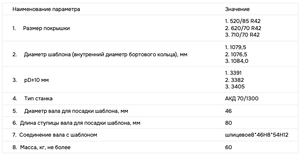 Шаблон 42″ к агрегату АКД 70/1300 предназначен для навивки в один или два ручья из резино-проволочной пряди бортовых колец для покрышек на кольцеделательном агрегате.
