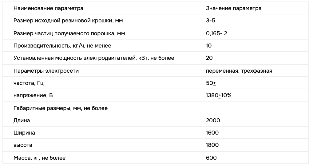 Устройство тонкодисперсного измельчения резины УТДИР-10, индекс ЕВП 04, предназначено для получения тонкодисперсного порошка из вторичных шинных резин. Область применения – производство переработки вторичных ресурсов (измельчение покрышек). Климатическое исполнение УХЛ 4 ГОСТ 15150-69, категория производства «В» по СНиП –2.09.02-85, эксплуатация в пожароопасных зонах класса П-IIа по ПУЭ-87. Станок может работать самостоятельно или входить в состав технологических линий.