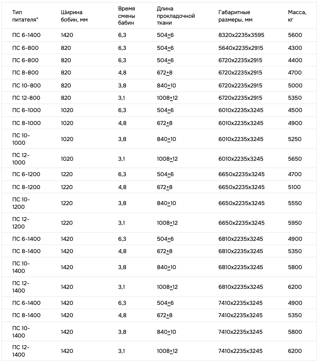 Примечание: *Цифры в обозначении типа питателя соответствуют количеству пар бобин каретке и ширине прокладочной ткани. Количество пар бобин соответствует слойности питателя.