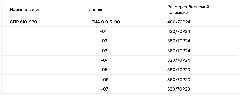 Станок для сборки покрышек типа СПР 610-930, индекс НЕИА 0.015, предназначен для двух стадийной сборки сельскохозяйственных покрышек радиальной конструкции на мягких сборочных барабанах (диафрагмах) браслетным методом. Область применения – шинное производство.