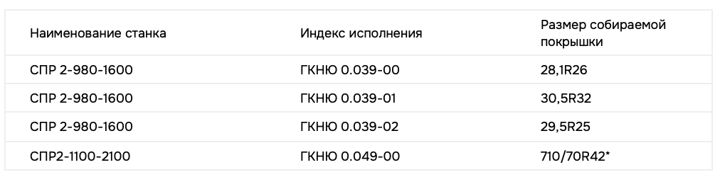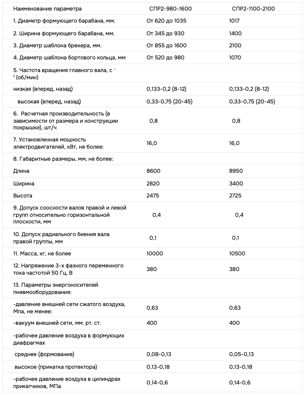 Станок для сборки покрышек СПР 2-980-1600, индекс ГКНЮ 0.039, предназначен для второй стадии сборки покрышек радиальной конструкции с посадочным диаметром от 20″ до 38″ на формующем барабане (диафрагме). Станок для сборки покрышек СПР 2-1100-2100, индекс ГКНЮ 0.049, предназначен для второй стадии сборки покрышек радиальной конструкции с посадочным диаметром 42″ на формующем барабане (диафрагме). Область применения – шинное производство. Климатическое исполнение станка УХЛ4 ГОСТ 15150-69. Станок предназначен для эксплуатации в помещениях класса П-Па по ПУЭ-87. Категория производства «В» по СниП 2.09.02-95. Станок эксплуатируется с питателем ПР 2-600, ПСт6-100, поставляемым по отдельному договору. Станок устанавливается в цехах сборки шин на 1 этаже или межэтажных перекрытиях производственных зданий с расстоянием между колоннами не менее 9м. Пример записи обозначения станка для сборки покрышек 30,5R32 при его заказе или в документации другой продукции, в которой он может быть применен: «Станок для сборки покрышек типа СПР 2-980-1600, индекс ГКНЮ 0.039-01, ТУ 3623-047-47150356-2001».