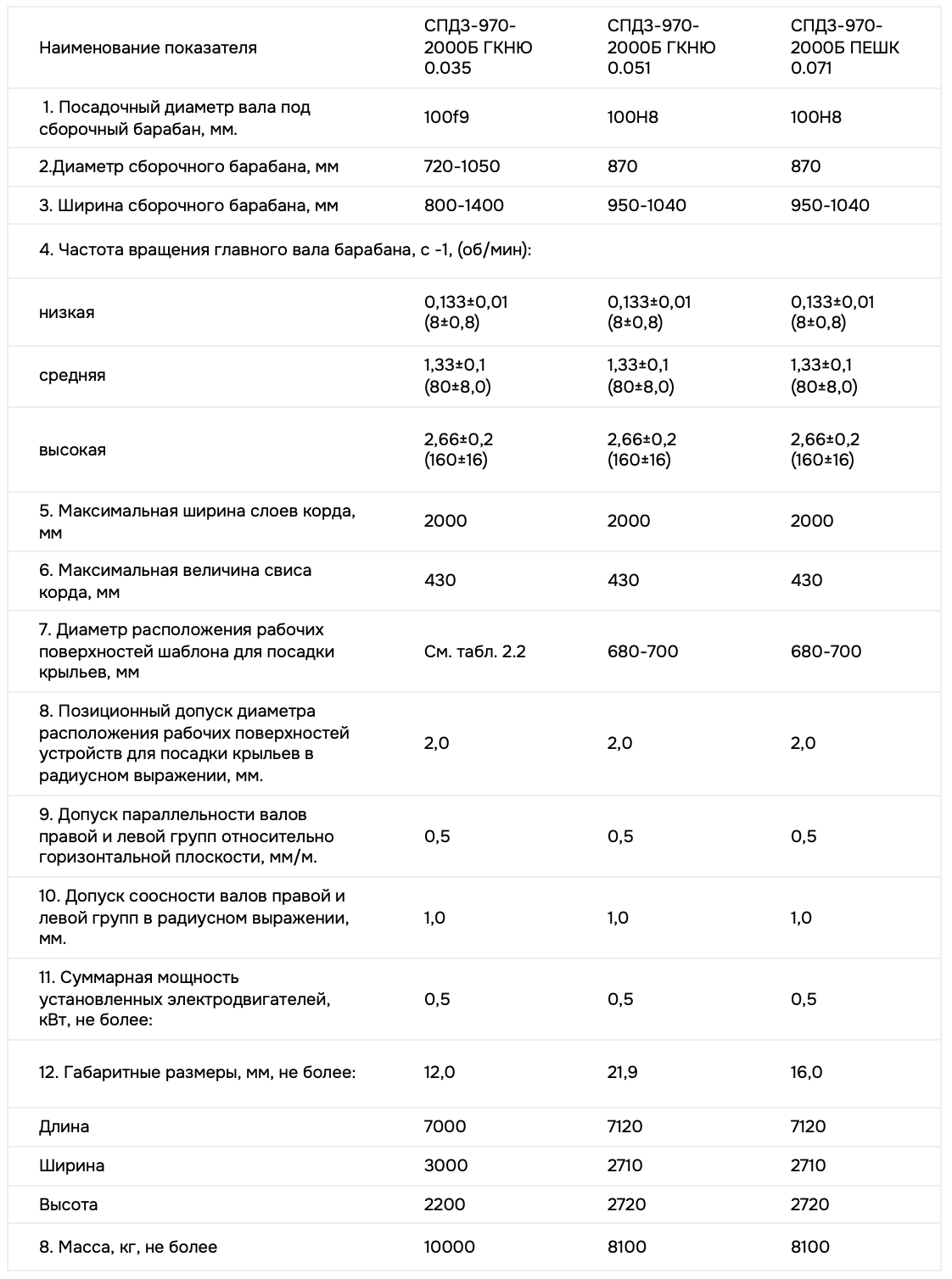 Станок для сборки покрышек типа СПД 3-970-2000Б, инд. ГКНЮ 0.035, предназначен для сборки браслетным методом покрышек диагональной конструкции на полудорновом барабане с посадочным диаметром обода от 24″ до 25″. Станок для сборки покрышек типа СПД 3-970-2000БМ, инд. ГКНЮ 0.051, предназначен для сборки браслетным методом покрышек диагональной конструкции на полудорновом барабане с посадочным диаметром обода от 24″ до 25″. Станок для сборки покрышек типа СПД 3-970-2000Б, инд. ПЕШК 0.071, предназначен для сборки браслетным методом покрышек диагональной конструкции на полудорновом барабане с посадочным диаметром обода от 20″ до 26,5″. Станок СПД3 инд. ГКНЮ 0.035 предназначен для работы с барабанами инерционного складывания. Станки СПД3 инд. ГКНЮ 0.051 и ПЕШК 0.071 предназначены для работы с рычажно-винтовыми барабанами. Станки СПД3 инд. ГКНЮ 0.051 и ПЕШК 0.071 отличаются друг от друга конструкцией прикатчиков. Область применения – шинное производство. Климатическое исполнение УХЛ 4 по ГОСТ 15150-69. Категория производства «В» по СНИП 2.09.02-85. Класса помещения П-IIа в соответствии с ПУЭ. Пример записи станка для сборки покрышек:«Станок для сборки покрышек СПД 3-970-2000Б, инд. ГКНЮ 0.035, ТУ 3623-027-47150356-2000. » «Станок для сборки покрышек СПД 3-970-2000Б, инд. ГКНЮ 0.051 » «Станок для сборки покрышек СПД 3-970-2000Б, инд. ПЕШК 0.071, ТУ 3623-075-57763781-2008. »