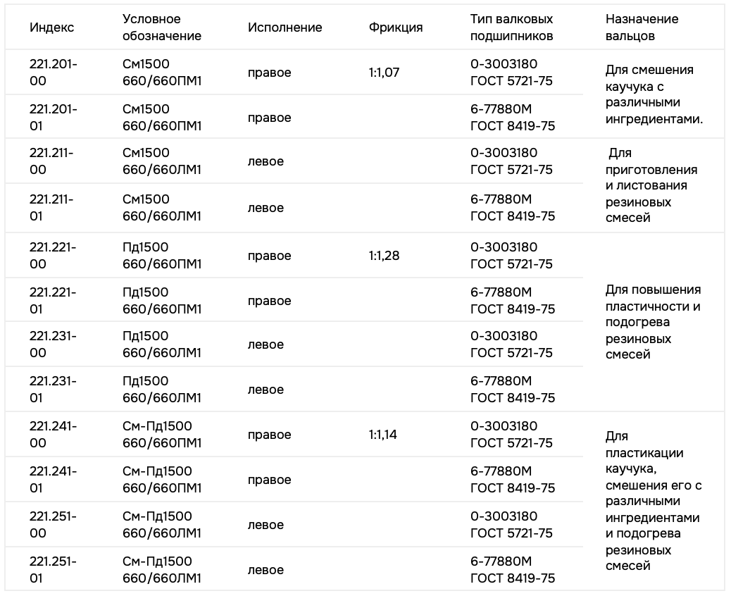 Производство вальцов резинообрабатывающих 1500 660/660М1, индекс 221…. , предназначенных для переработки резиновых смесей на основе натуральных и синтетических каучуков в помещениях с искусственно регулируемыми климатическими условиями. Область применения – РТИ, шиноремонтное производство и др. Производство вальцов, которые могут работать самостоятельно или входить в состав различных технологических линий. Климатическое исполнение вальцов УХЛ 4, ГОСТ 15150-69. Производство вальцов предназначенных для эксплуатации в помещениях П-IIа по ПУЭ-87. Категория производства «В» по СНиП П-90-81.